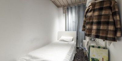 U minijaturnom stanu nalazi se krevet, a odmah pored njega je kada, iznad koje se na polici nalazi mašina za veš.