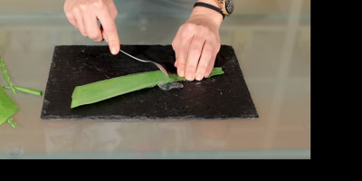 Izaberite najdeblji list aloe vere pazeći na ostale. Kako bi se tamnožuta sluz osušila taj list držite uspravno na oko 10 minuta. Zatim ga položite na ravnu površinu, isecite bočne delove i gornji sloj i uz pomoć kašike skupite gel.