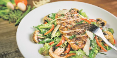 Ručak: pileća salata, rukola, paprika, crveni luk, celer