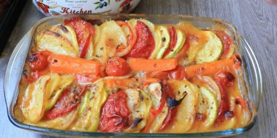 Sve izmešati, dodati začina, soli, belog luka, bibera i ulja i sve izjednačiti. Naizmenično poređati u podmazan pleh, Između poređati paradajz.
