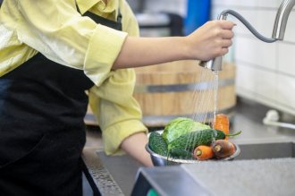 - Pre pranja prvo dobro operite ruke toplom vodom i sapunom. Potom izrežite sva udubljenja i trule "izbočine" sa voća i povrća. Nežno brišite namirnicu, dok je držite pod hladnom, tekućom vodom. Za namirnice sa tvrđom korom, koristite četku, koja se koristi isključivo za čišćenje voća i povrća.
