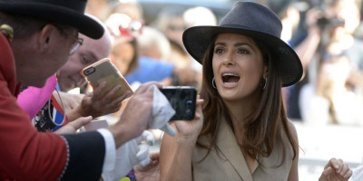 Selma Hajek je skočila na svog muža u bazenu. On se vidi straga, a ona blista u jarko ružičastom kupaćem kostimu, sa vlažnom i gustom puštenom crnom kosom.