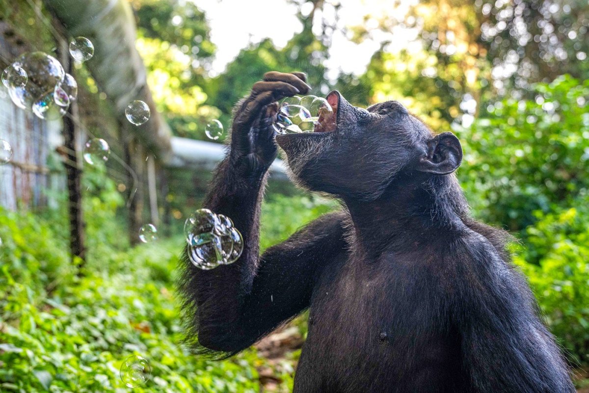 U početku su šimpanze oprezno posmatrale neobične, šarene kugle koje plutaju vazduhom. Neki su ih dodirivali vrhovima prstiju, drugi su pokušavali da ih uhvate ustima, dok su najmlađi skakali u pokušaju da ih dohvate pre nego što nestanu.