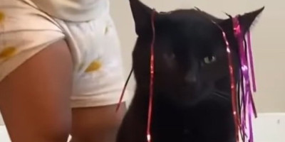 Dok se dete ludo zabavljalo ukrašavajući mačku raznim trakicama, ona je nepomično sedela i mahala repom, kao da nema nijednu brigu na svetu.