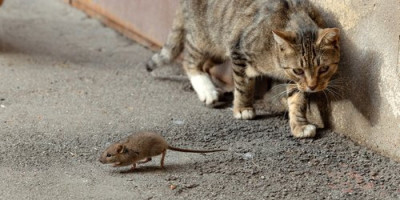 Jedna mačka se odvažila da najbliže priđe mišu koji se zatekao u kući, ali deluje krajnje zapanjeno zbog tog stvorenja ispred sebe. U nekoliko trenutaka ona gleda iznenađeno u pravcu svoje vlasnice.
