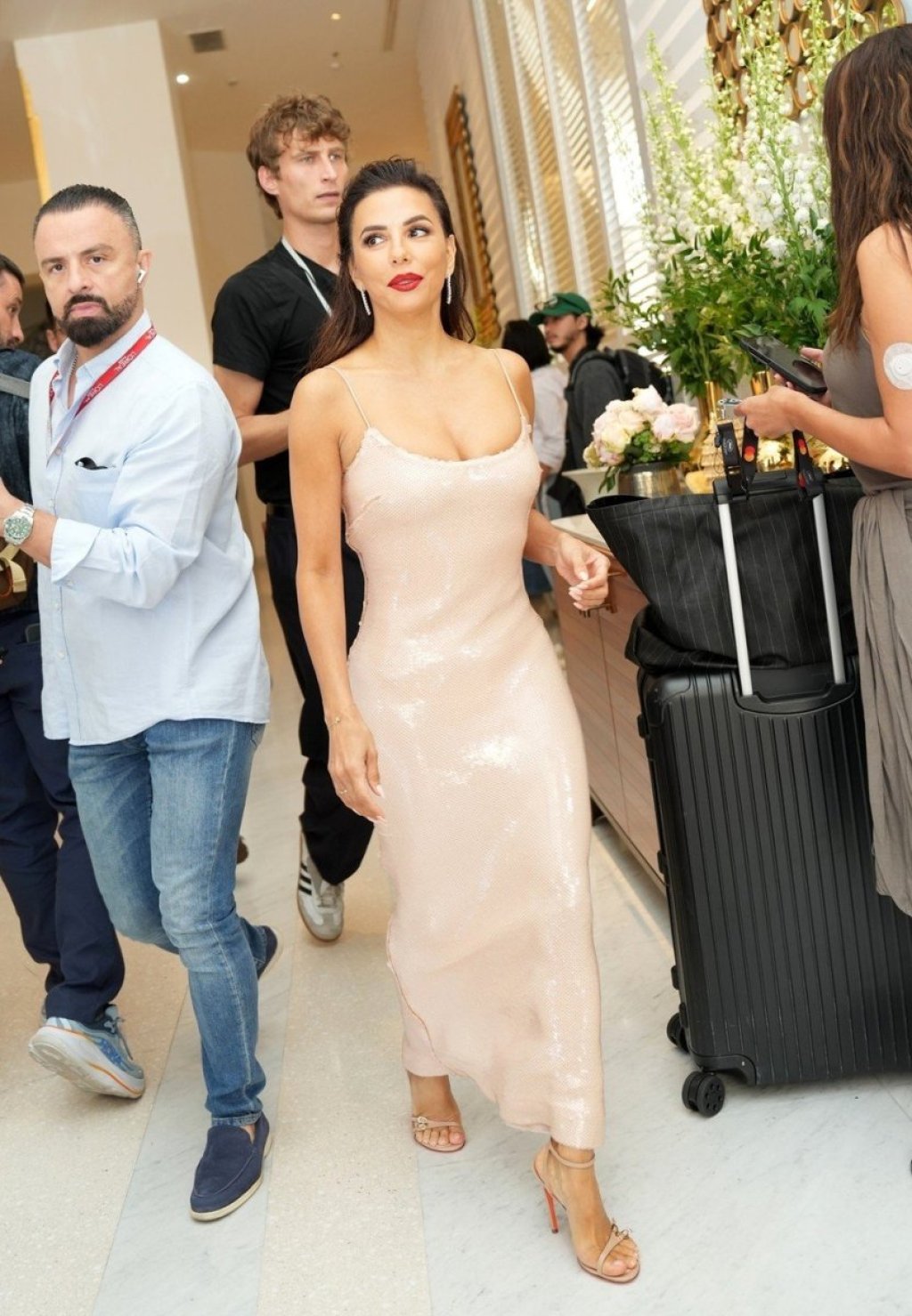 Eva se držala za ruke svog tima dok je pažljivo silazila niz stepenice hotela, pre nego što je uzela gutljaj toplog napitka. Glumica je blistala dok je prolazila kroz hotelski lobi, držeći u ruci naočare za sunce.