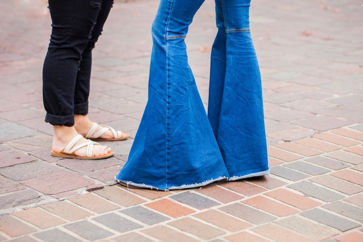 Isecite trouglaste komade od šarenog platna – širina zavisi od toga koliko želite da vam zvono bude veliko. Ušijte ih na isečene strane farmerki, tako da se lepo šire pri hodu.