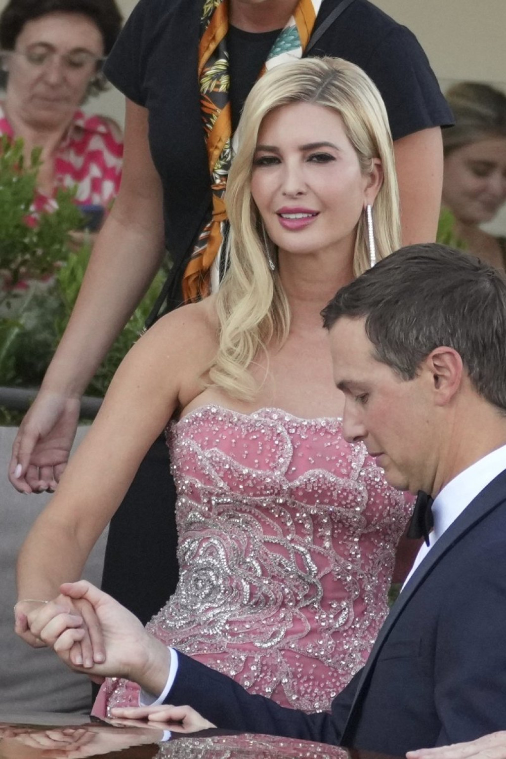 Ivanka Tramp je stigla na slavlje u toaleti koju potpisuje brend Toni Vard, modelu svetloroze boje, bez bretela, koja je prekrivena srebrnim perlicama koje stvaraju šare u obliku latica cveća celom dužinom haljine.