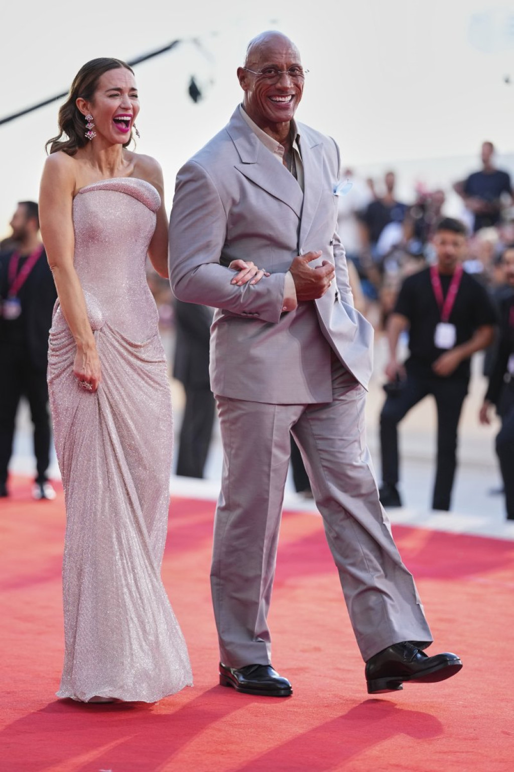 Na crvenom tepihu pridružio joj se Dvejn Džonson, odmeren i šarmantan u elegantnom sivom odelu, beloj košulji bez kravate i prepoznatljivom širokom osmehu. Njih dvoje su očigledno uživali, mahali su publici, pozirali rame uz rame, i uz osmeh prekinuli formalnosti kratkim, prijateljskim razgovorom.