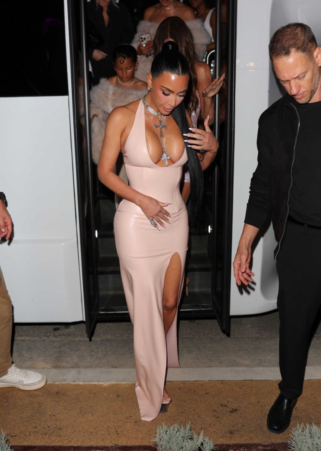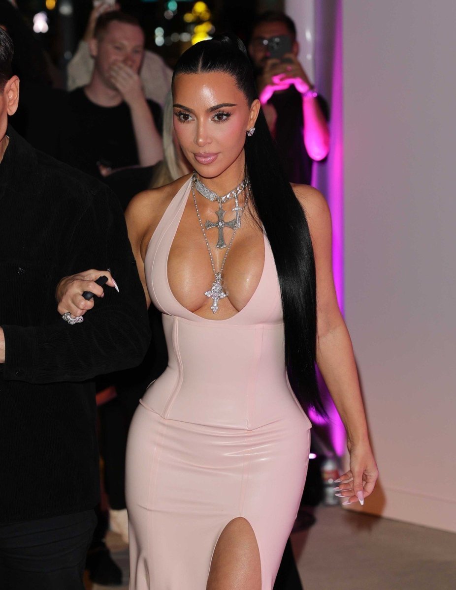 Bledo roze lateks haljina sa dubokim izrezom savršeno je istakla Kimine obline. Uz haljinu je kombinovala providne platforme koje su joj dodale visinu i dodatno naglasile vitke i tonirane noge, prenosi Daily Mail.