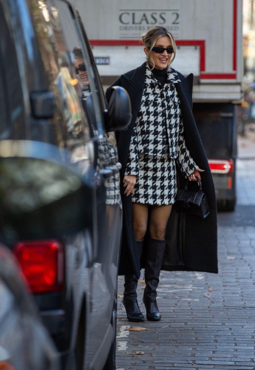Ovaj sofisticirani look istakao je njene vitke noge, a smela i moderna obuća dodatno je podstakla pažnju. Crne kožne čizme na visoku potpeticu i crna tašnica bili su pun pogodak.