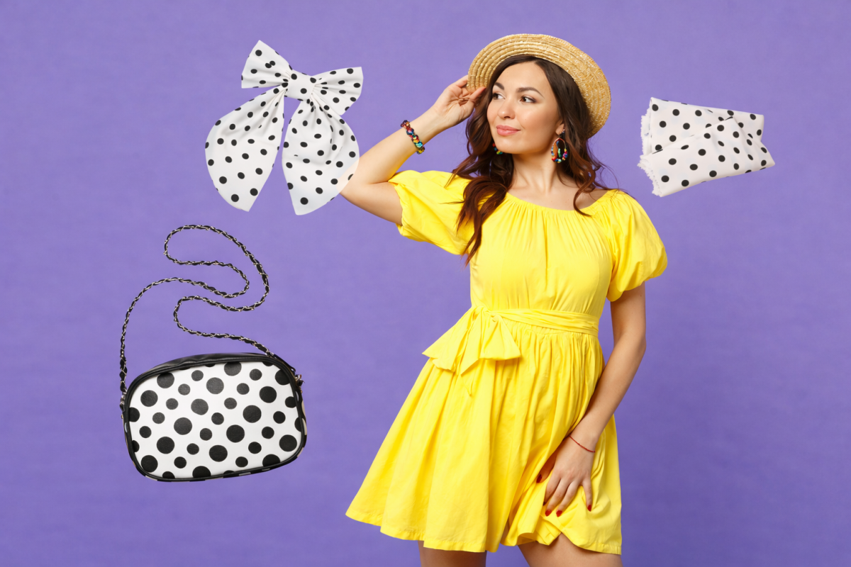 Ova kombinacija funkcioniše jer žuta nosi energiju i optimizam, dok tačkice unose dinamiku bez preuzimanja glavne uloge. Sitni dezen daje retro vibru, ali u modernom kontekstu deluje razigrano i urbano.
