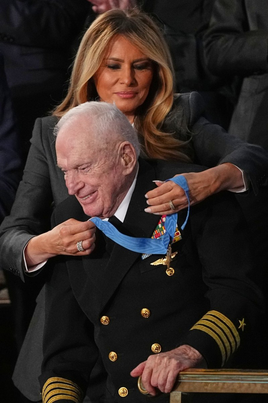 Melanija Tramp je imala i ceremonijalnu ulogu, a tokom večeri uručila je Kongresnu medalju časti kapetanu Rojsu Vilijamsu, veteranu iz Drugog svetskog rata. Ovaj mornarički pilot postao je poznat po jednoj od najspektakularnijih vazdušnih bitaka u istoriji, kada se u novembru 1952. sam suočio sa sedam sovjetskih lovaca MiG-15.