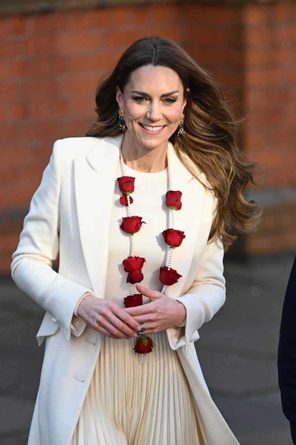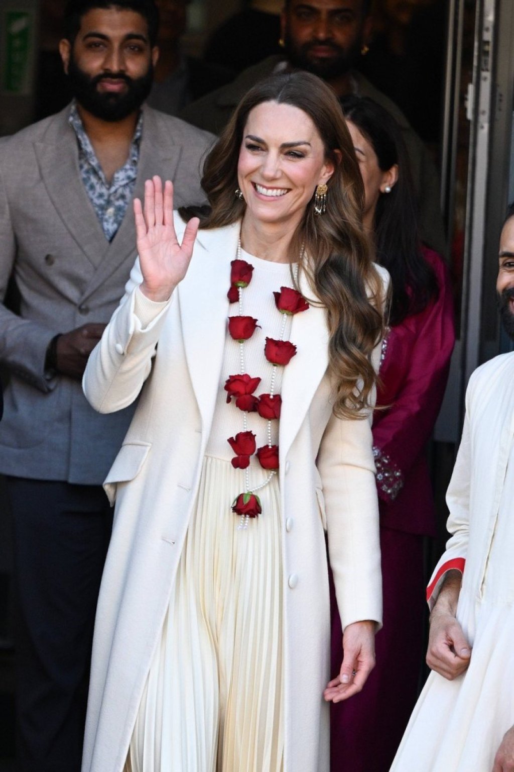 Njena ogrlica od bisera sa upletenim ružama, poklon indijske zajednice, savršeno je upotpunila stajling, dok su zlatne minđuše sa plavim kamenčićima i poklon od princ Vilijam, unele diskretan sjaj luksuza. Istovremeno, ovi detalji su sačuvali jednostavnost i prozračnost njenog prolećnog izdanja.