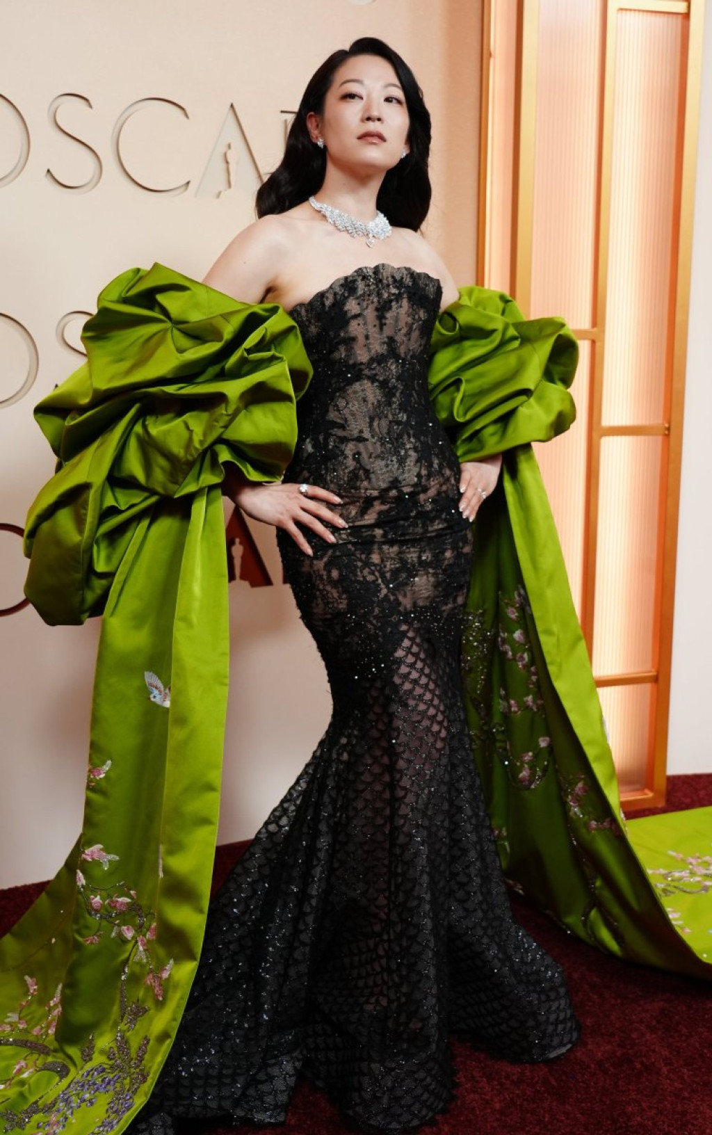 Njen izbor za ovu posebnu noć bila je raskošna haljina koja kombinuje klasičnu eleganciju sa modernim umetničkim detaljima. Haljina je imala bogato izvezene rukave u zelenoj nijansi koji su doprinosili sjajnom efektu i delovali kao prava modna skulptura, dok je ostatak kroja bio sofisticiran i ženstven, idealan za ovakvu ceremoniju.