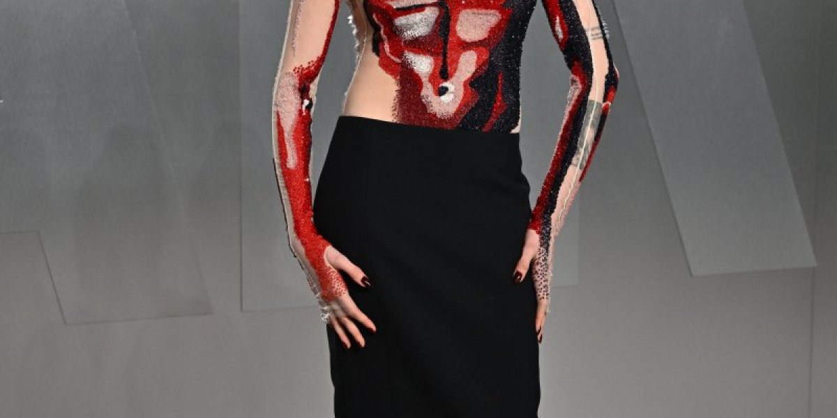 Crveni, crni i beli detalji stvarali su efekat apstraktne slike preko njenog torza i ruku, zbog čega su mnogi u prvi mah pomislili da je reč o "body paintu".