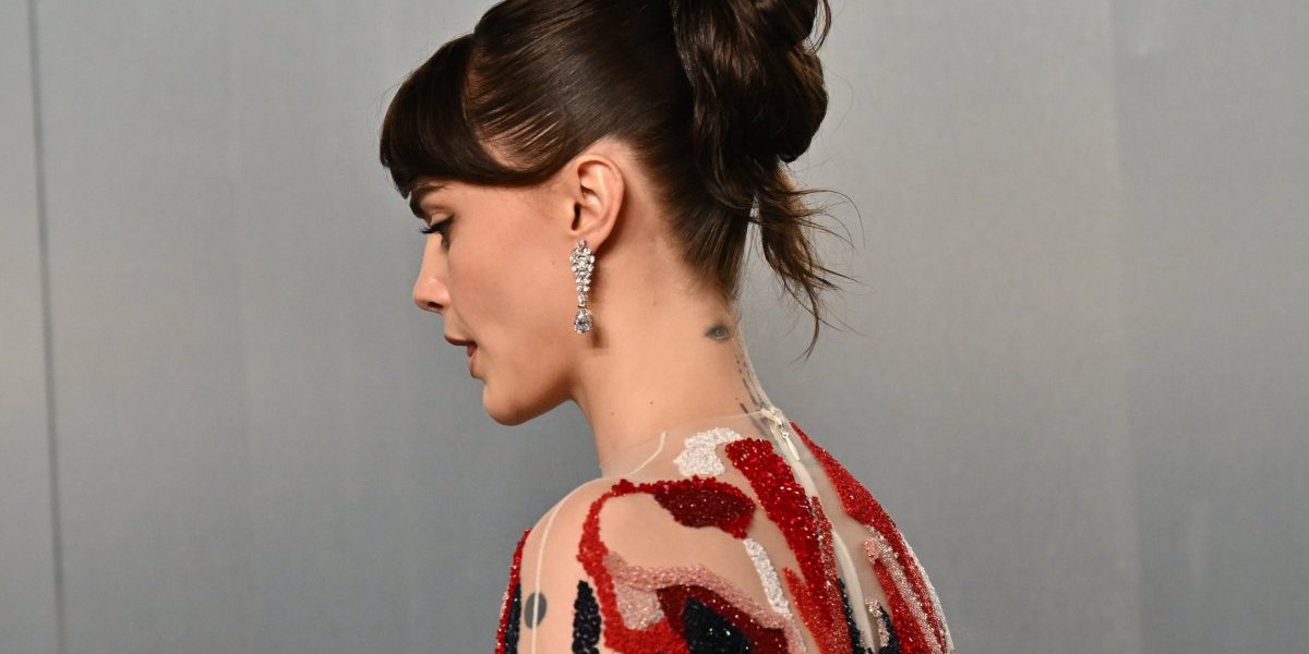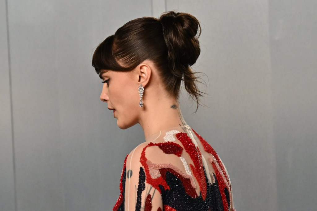 Minimalistička frizura sa podignutom kosom dodatno je naglasila njene prepoznatljive crte lica, dok su diskretne minđuše i tamni nokti upotpunili dramatičan izgled.