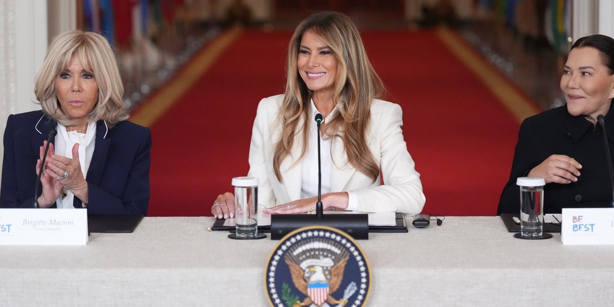 U tamnijem, klasičnom kompletu sa belom bluzom, Brižit je izgledala sofisticirano i nenametljivo, ali savršeno uklopljeno uz Melanijin besprekorni stil.