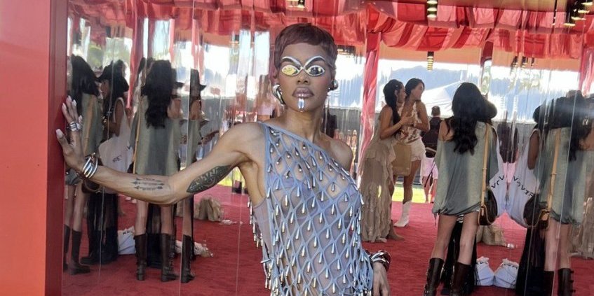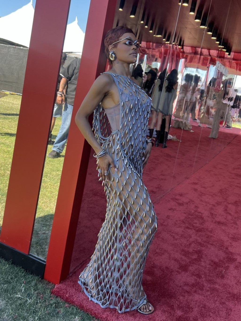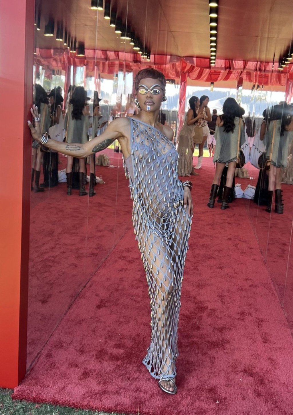 Celokupan izgled upotpunila pažljivo odabranim detaljima. Posebno su se izdvajale futurističke sunčane naočare iz kuće Schiaparelli, koje su bile toliko upečatljive da ih je bilo nemoguće ne primetiti. Pored njih, nosila je i pirsing na usnama, kao i masivniji nakit u vidu narukvica, minđuša i prstenja, što je dodatno naglasilo njen smeli i eksperimentalni stil.