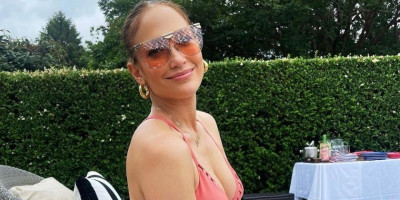 Jednodelni kupaći kostim Dženifer Lopez je malo drugačije, zagasitije roza nijanse. Odlično joj stoji, a ima zanimljiv dekolte sa ukrasima i veliki izrez na leđima.