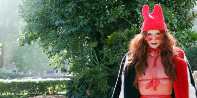 Pripremajući se za Dan zaljubljenih, 14. februar, odabrala je crveni mrežasti bodi, potpuno providan. Preko grudi je crvena traka, a u predelu intimne regije veliki crveni trougao.
