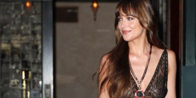 Smeđa haljina sa velikim dekolteom i detaljima od čipke na njemu Dakoti Džonson je savršeno stajala.
