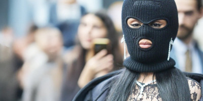 Ona je pozirala u crnoj kratkoj suknji i prozirnom crnom bodiju od čipke ispod koga je nosila brus istog materijala. Preko svog modnog outfita imala je dugačak crni kaput, a veliku pažnju je privukla crna fantomka koju je nosila na glavi.
