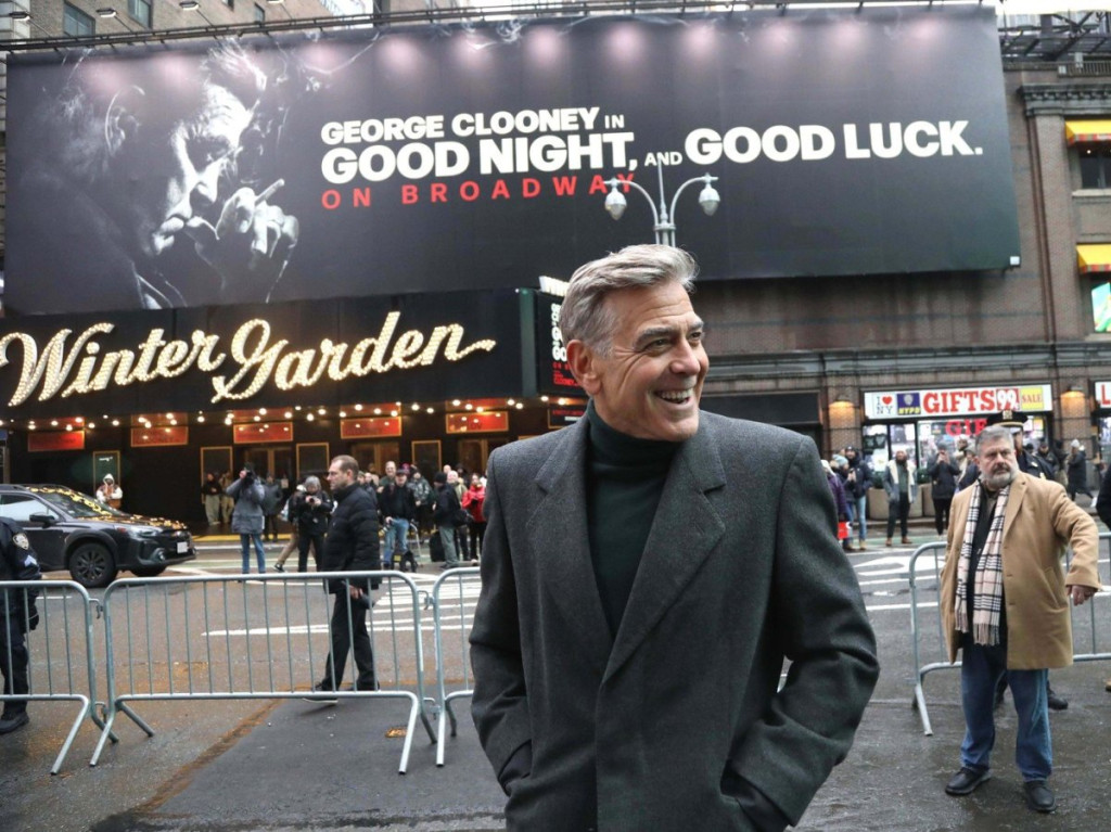 Džordž Kluni je uslikan na Brodveju u Njujorku dok je najavljivao glumačku ekipu nove predstave "Laku noć i srećno".
