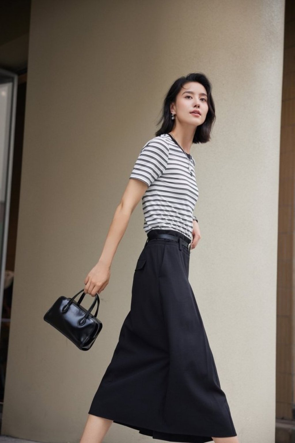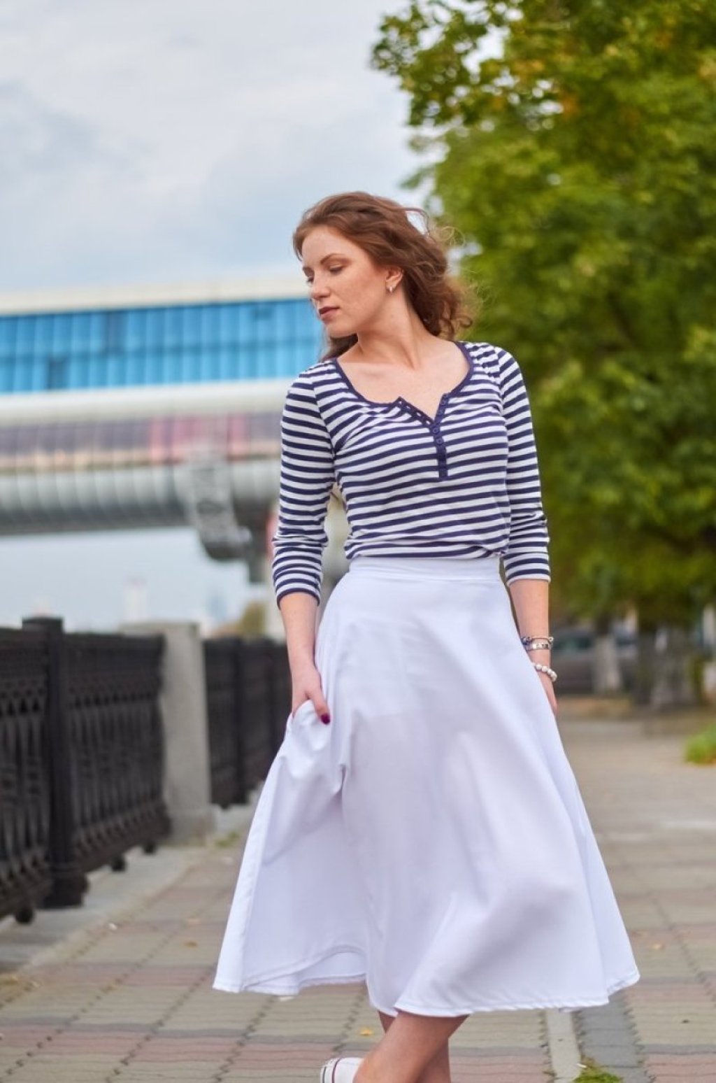 Pruge vrlo efektno izgledaju i kada se spoje sa suknjom. Tako klasičnu plavo-belu prugastu majicu možete nositi sa svetlom suknjom. Možete odabrati i elegantniju kombinaciju - crnu suknju sa crno-belom majicom.