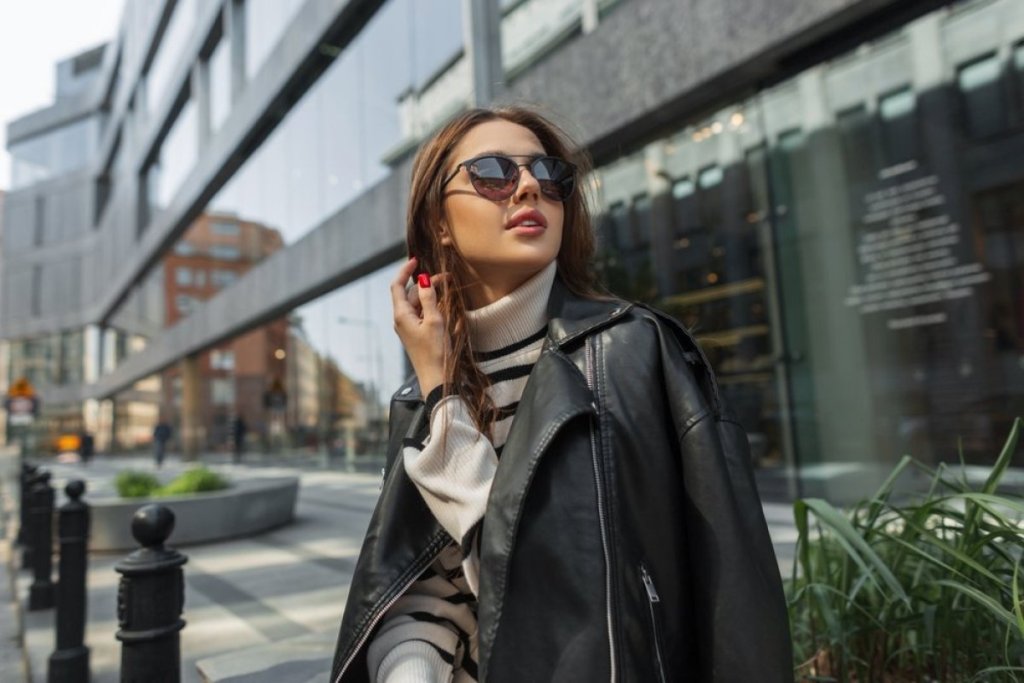 Tokom hladnijih prolećnih dana možete da nosite prugasti pleteni džemper ispod bajkerske jakne.