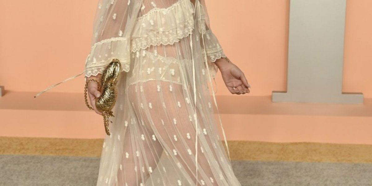 Kombinacija providne tkanine sa belim donjim vešom dodatno je naglašavala senzualnost, dok je diskretan pribor u obliku školjke dopunio modernu interpretaciju retro elegancije.