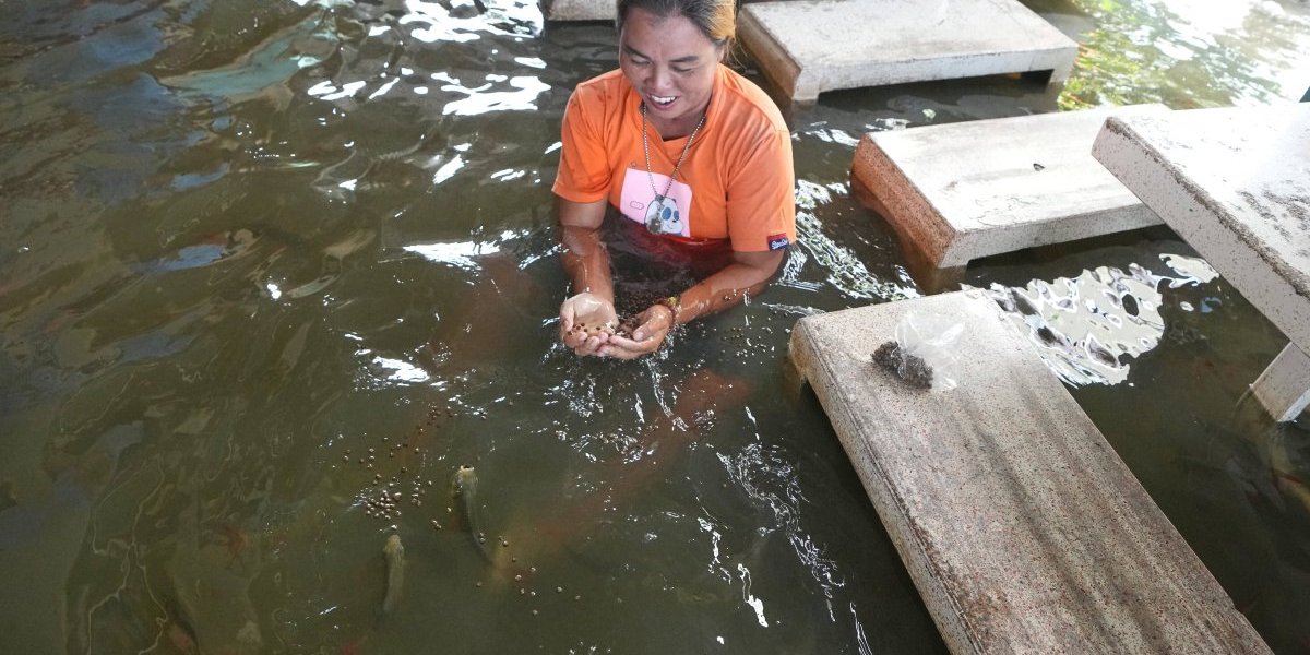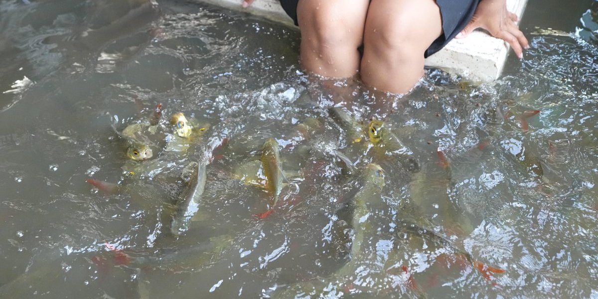 Porodice uživaju u ručku dok se mališani igraju sa ribama koje im se motaju oko nogu. Osoblje u čizmama donosi činije sa ribljom supom i nudlama sa piletinom od stola do stola, a gosti poziraju ili bacaju hranu ribama da bi posmatrali uzbudljivu borbu za obrok.