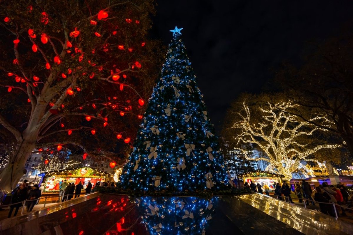 Spektakularna rasveta i praznično drvo – svake večeri trg sija u hiljadama lampica.