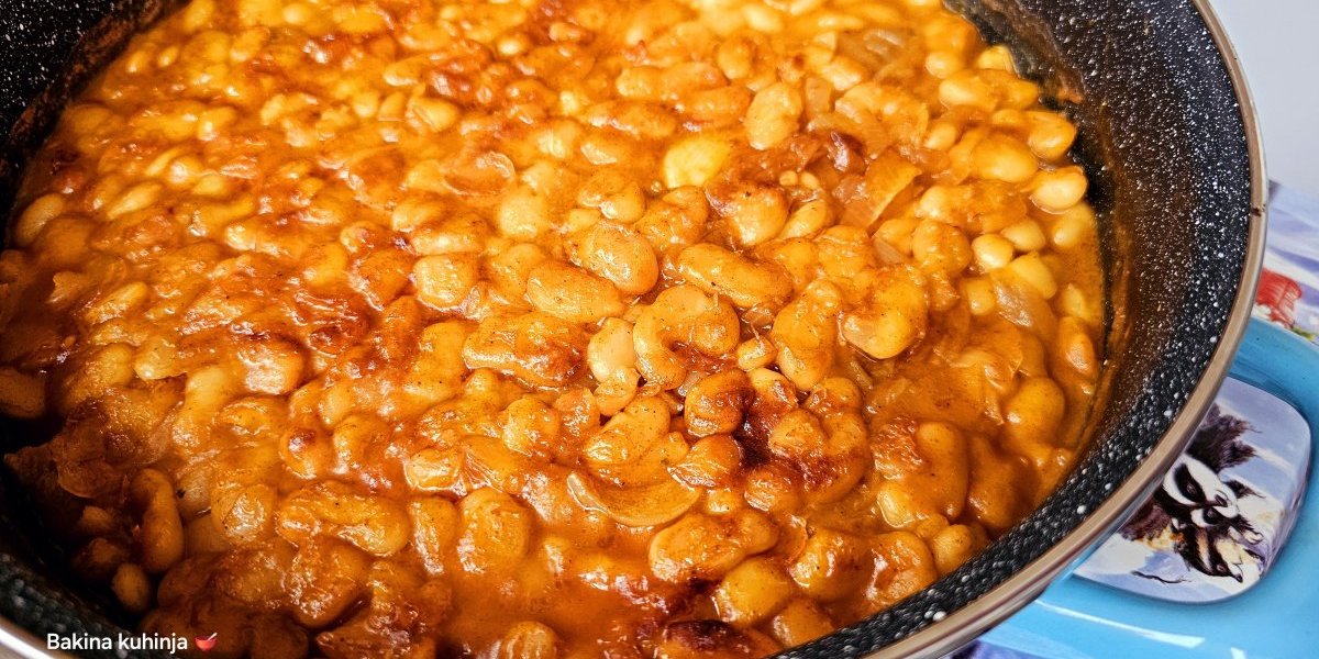 Odozgo dodati još malo paprike mlevene i ulja i malo tečnosti što smo ocedili iz pasulja. Peći na 220 stepeni 30 minuta.