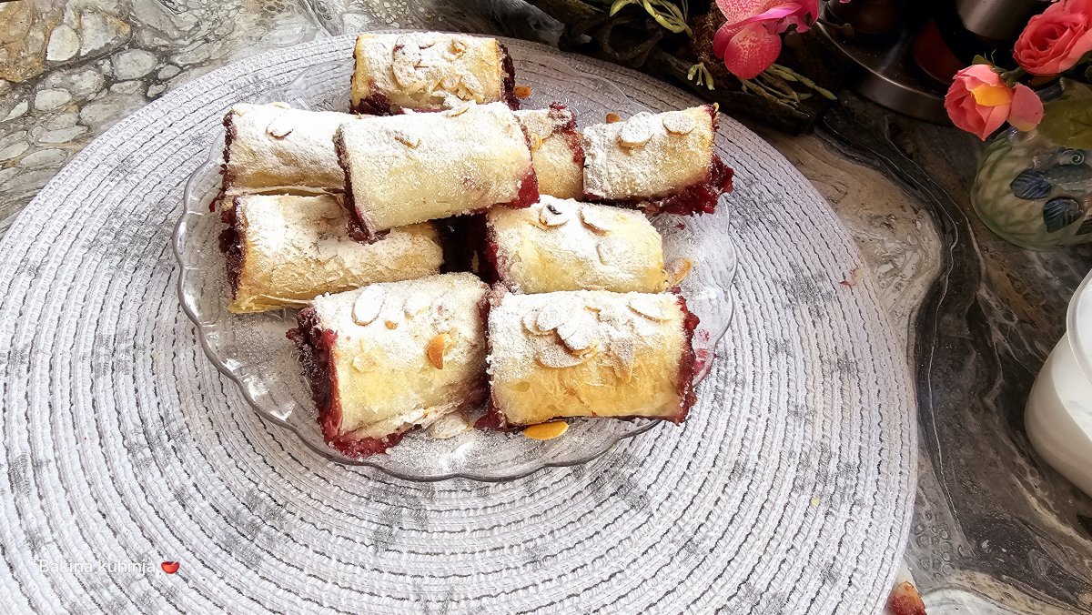 Na petu koru u dno staviti pola višanja pa uviti u rolat. Tako i drugi rolat. Poseći rolate premazati uljem i posuti listićima badema.