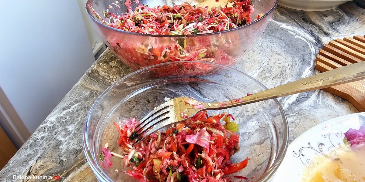Dodati po želji ljutu papričicu, so, limunov sok i ulje i sve izmešati dobro. Ostaviti da odstoji bar pola sata, pa još jednom izmešati.