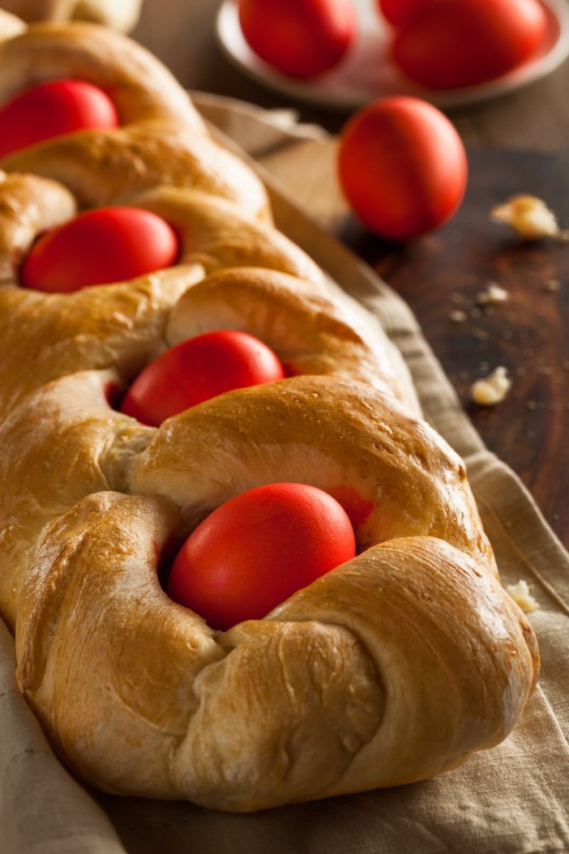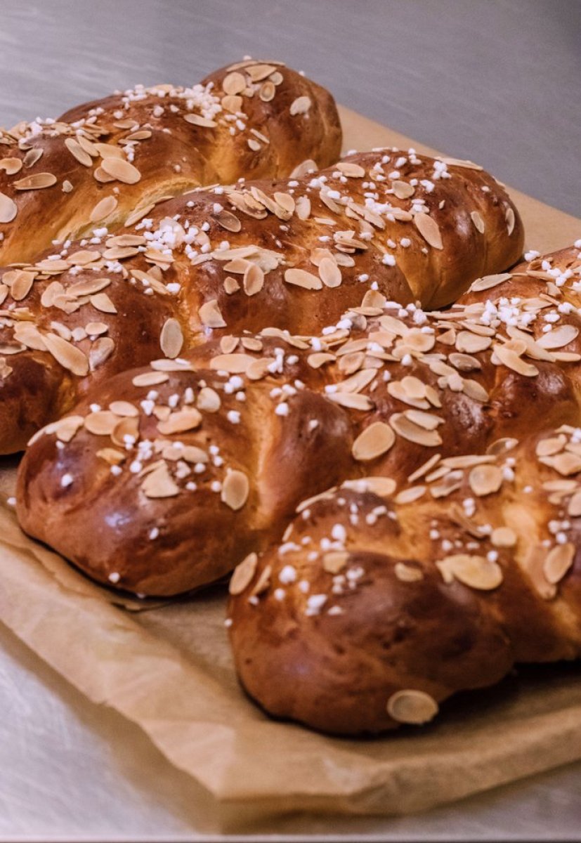 Podelite testo na dva dela i svaki deo odvojite na tri dela. Ispletite svaki od 3 pramena testa zajedno da biste dobili 2 pletene vekne. Stavite ih na pleh za pečenje. Testo premažite preostalim razmućenim jajetom. Površinu pospite bademima i susamom. Pecite u zagrejanoj rerni do zlatno smeđe boje, oko 25 minuta.