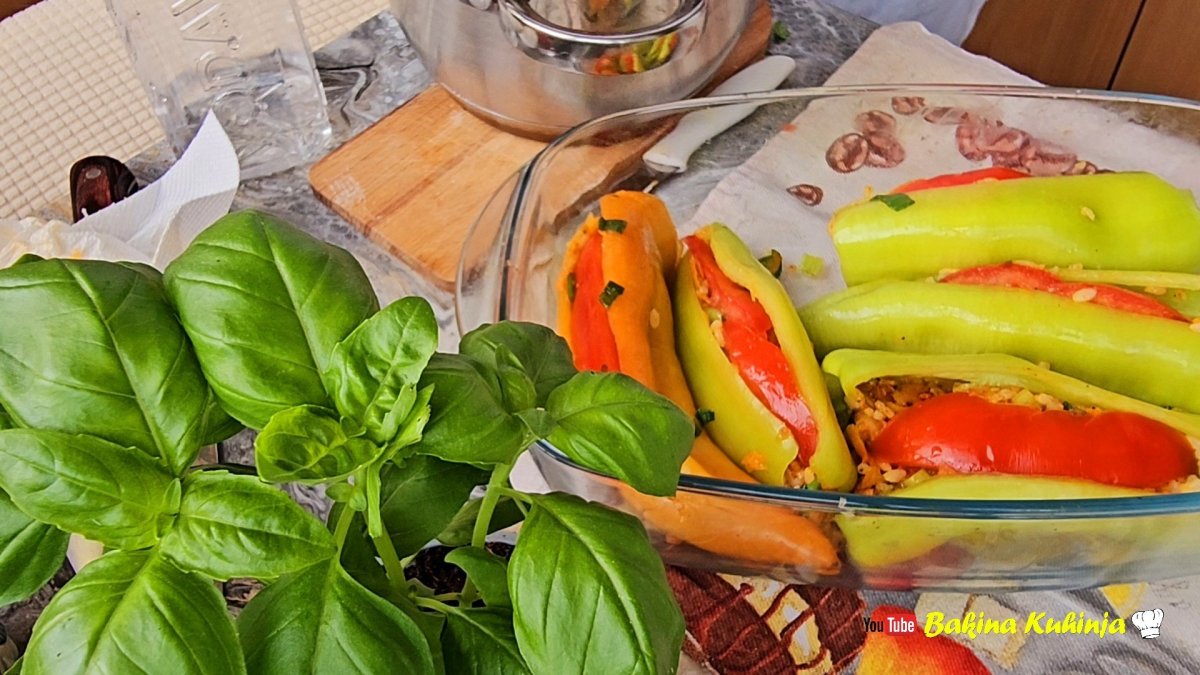 Preliti paprike i peći malo pokrivene na 220 stepeni, pa ih otkriti i smanjiti vatru na 200 stepeni oko 45 minuta. Ako vam ostane nadeva sipajte vodu, dodajte zalin, mleveni biber i skuvajte čorbicu.