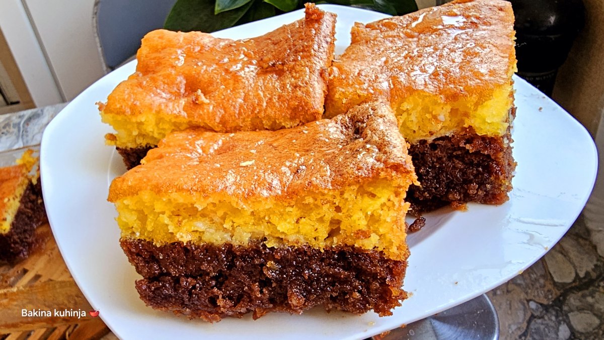 Izvaditi kolač iz rerne, pa preliti preko čokoladnog dela i peći još 30 minuta. Malo ohladiti, pa iseći na kocke.