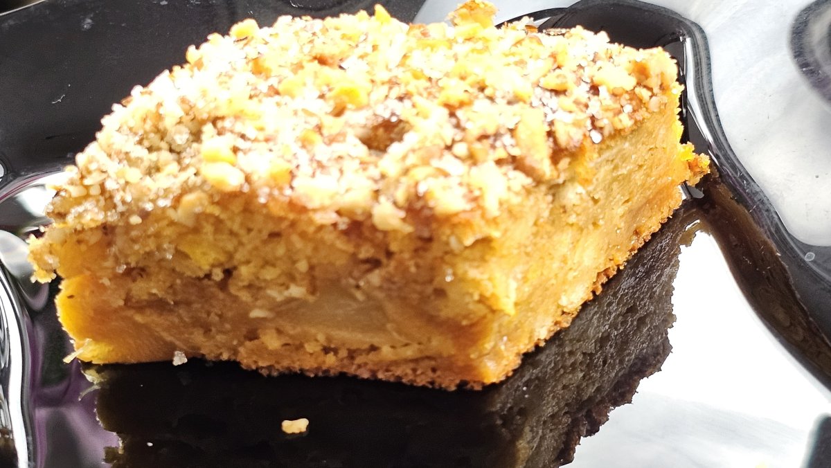 Ubaciti jogurt ulje i sve izmešati lagano. Jabuke malo prohladiti pa sipati u testo i lagano izjednačiti. Sipati u pleh obložen pek papirom. Odozgo rasporediti seckane orahe.