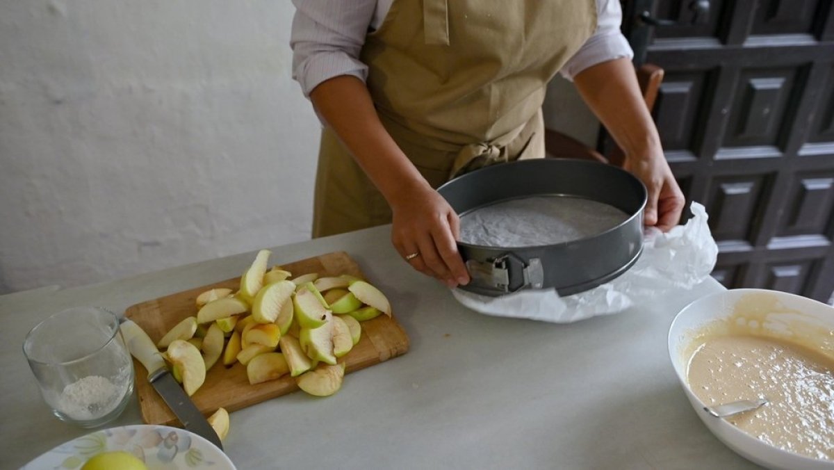 Obložite kalup prečnika oko 20 cm papirom za pečenje pa na dno stavite jedan deo suve smese, na to red jabuka pa opet red suve smese i tako dok ne potrošite suvu smesu i jabuke. Na kraju izbodite viljuškom kolač.