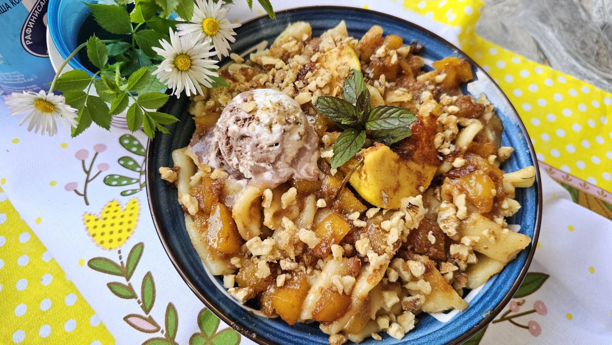 Sklonite sa vatre. U pastu dodajte jabuke sa karamelom, ostavite malo za vrh. Dodajte kuglu sladoleda i seckane orahe.
