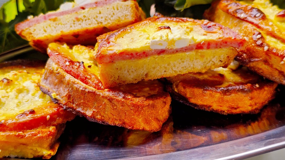 Hleb umočiti u jaja sa jedne i druge strane i redjati u pleh. Odozgo staviti list šunke, pa sipati ostatak preliva.