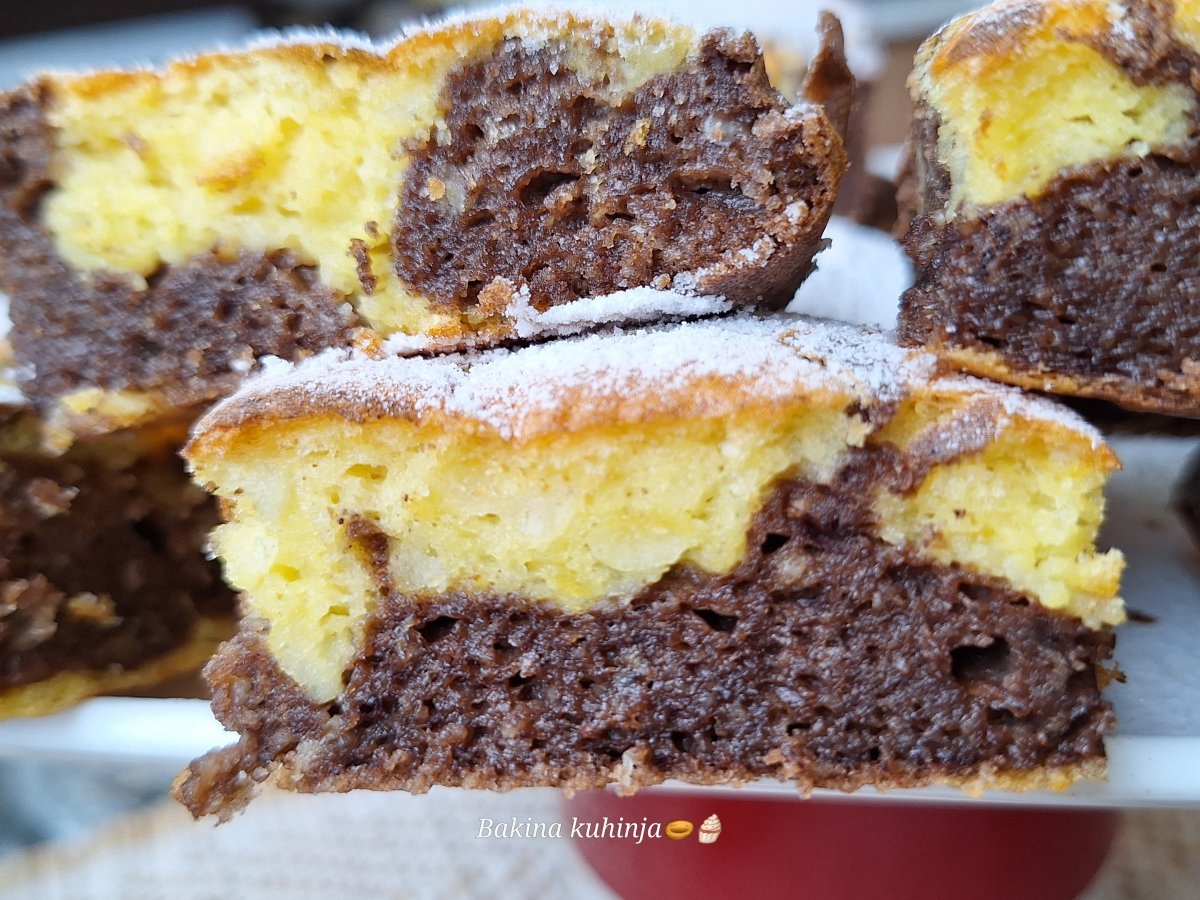 Ovaj kolač je izuzetno ukusan, miriše na čokoladu i lako se pravi. Podelite smesu na dva dela - jedan sa istopljenom čokoladom i kakaom, a drugi sa osvežavajućom koricom limuna.