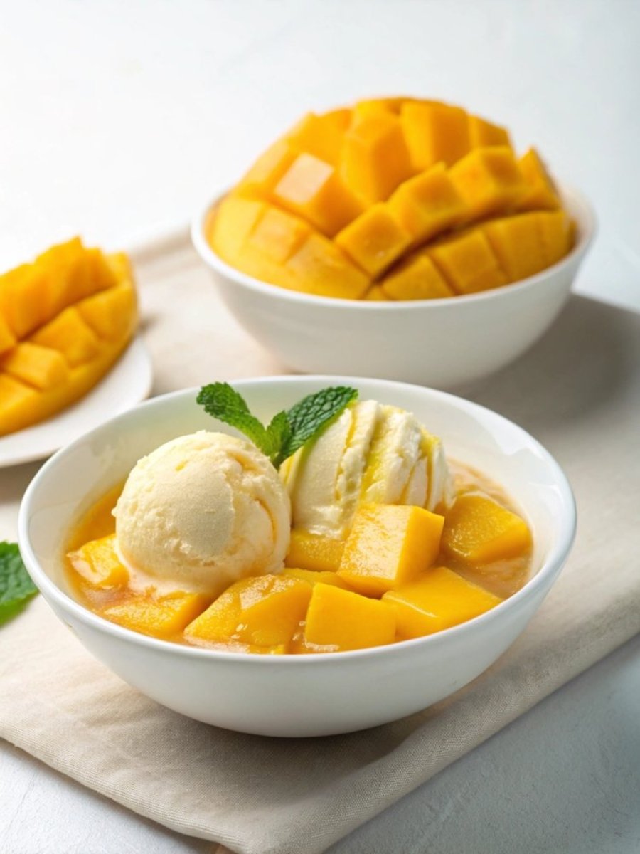 Pre serviranja, ohlađeni kremasti deo prelijte pripremljenim, ohlađenim komadićima manga. Dekorišite sa po nekoliko listova sveže nane. Uživajte u osvežavajućem i tropskom ukusu!