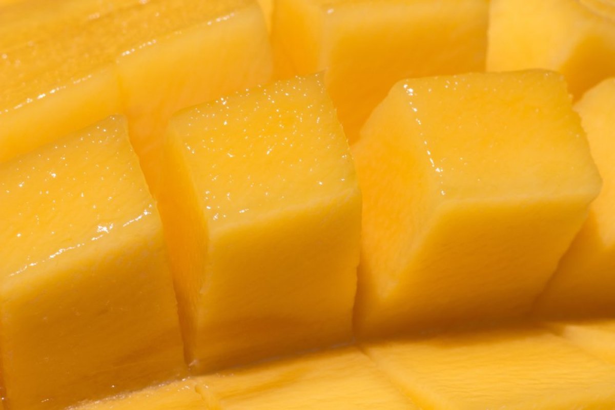 Mango isecite na sitnije kockice. U manjoj šerpici pomešajte vodu i šećer, pa zagrevajte na umerenoj vatri dok se šećer potpuno ne rastopi i smesa ne postane blago sirupasta.