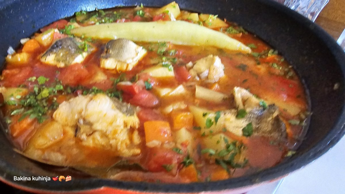Dodati alevu papiku, začin i kormpir na kockice, po želji ljutu zelenu papriku. Naliti vodu da provri i kuvari 15 minuta. Ubaciti ribu na manje komade.
