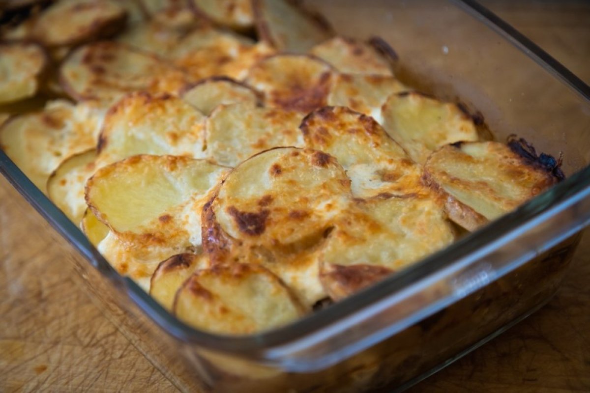 Za ovo jelo krompir se prvo oljušti (ako nije mlad), a zatim se preseče na pola po širini. Svaki komad se izdubi sa šire strane, tako da nastane mala korpica, dok se donja strana poravna kako bi mogao da stoji uspravno. Važno je da ne probušite dno.