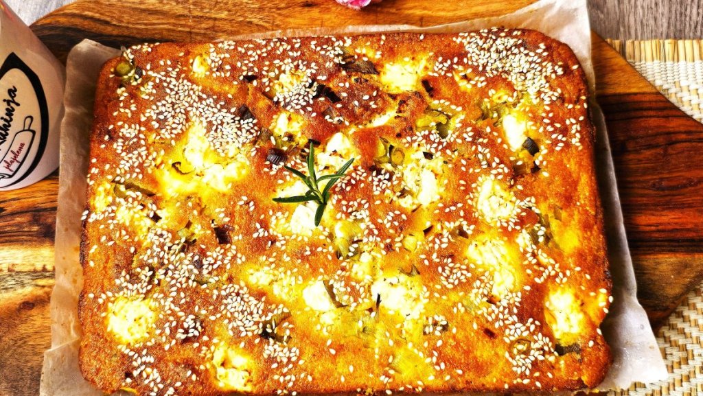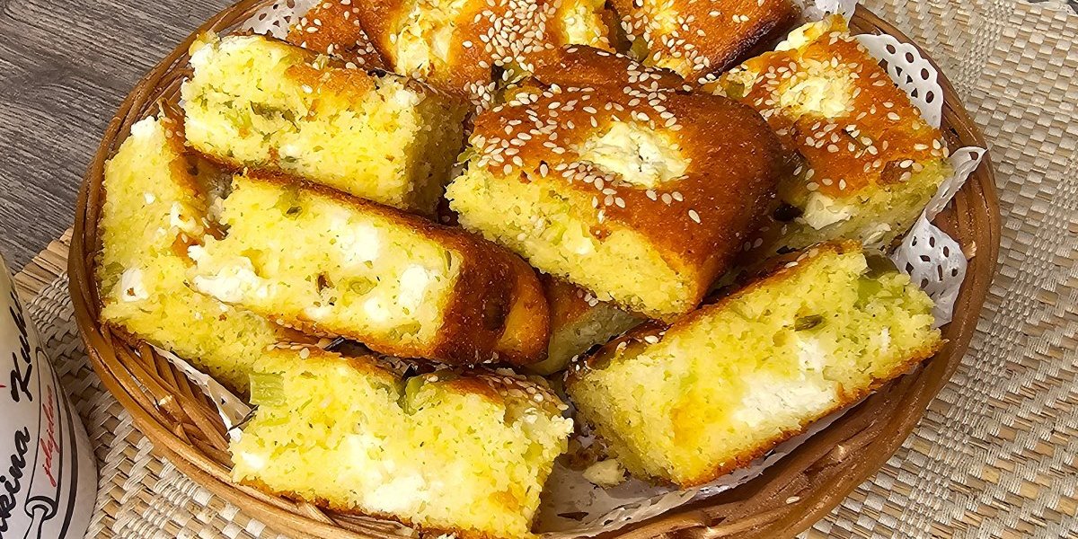 Žicom umutiti jaja i ubaciti brašno sa praškom za pecivo, a zatim dodati kukuruzno brašno i propržen seckan praziluk.