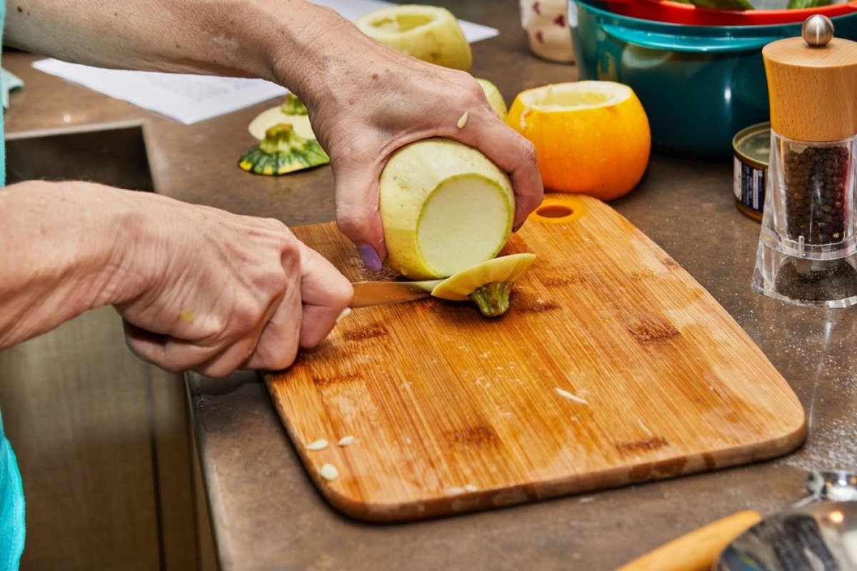 Tikvice najpre operite, a zatim ih isecite na deblje kolutove, otprilike 2-3 cm. Pomoću male kašičice pažljivo izdubite sredinu svakog koluta, ali ne do kraja, potrebno je da napravite udubljenje za punjenje, a da kolut ostane čvrst. Izdubljene delove tikvica nemojte bacati.